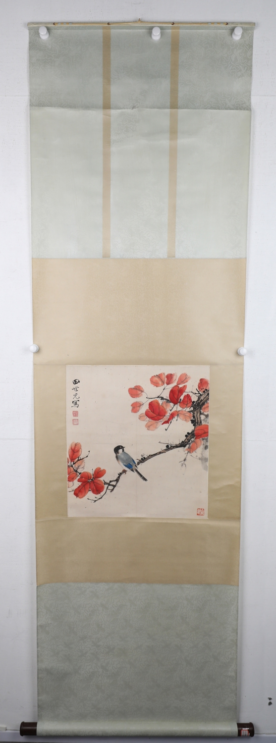 田世光(1916年10月—1999年7月)号公炜,祖籍山东乐陵,世居北京西海淀六郎庄。师承张大千、赵梦朱、吴镜汀、于非闇、齐白石诸先生。早年拜张大千门下,为大风堂弟子之一 。早年求学于京华美术学院,专攻国画花鸟,解放前在北平国立艺专任教,曾任中央美院教授。他长期从事花鸟、山水画创作,继承了宋元派双勾重彩工笔花鸟画的优良传统技法,并赋之予新的时代精神,为我国现代工笔花鸟画名家。田世光先生是中国美术家协会会员,北京工笔重彩画副会长,中国画研究院第一届院务委员。