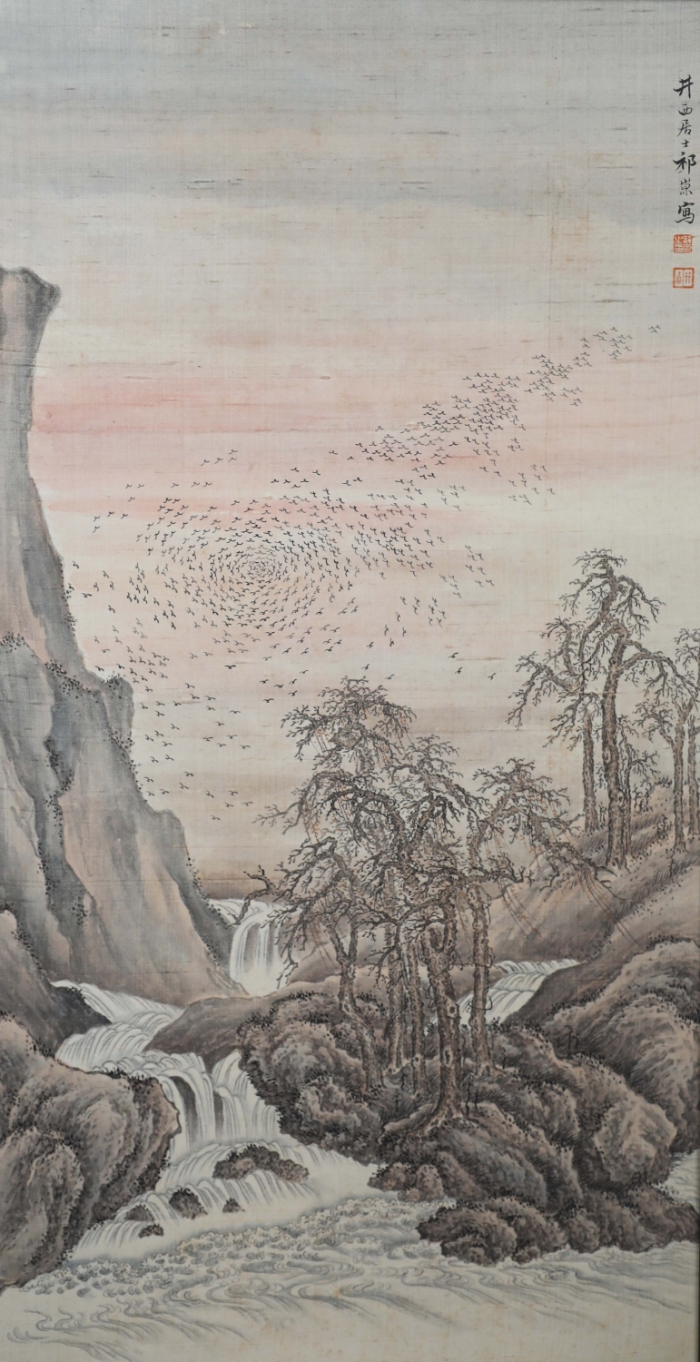 祁井西(又名祁昆1901—1944)字景西,号井西居士斋号曰松崖精舍。北京人。初以籹卖颜色得识京城名家,刻励自学。因受民初追踪宋元之风的影响,专意摹古临古,尚北宗山水,所画理法精严,笔墨精致,枯润合度。在20-40年代的北京有一定影响。工细山水得明人遗意,又精篆刻。性喜犬,室内床上下所蓄犬无思十余头,可谓奇癖,所作山水,规模明人,而近于王翚。作风精细清润,构图全出之正统派民国初年北京画坛以王翚为“神圣不可侵犯”,祁氏亦受影响,在学王诸诸家中堪称翘楚。但用笔略嫌拘谨板实,工稳有余,创意不足。弟子有郭传璋徐鼎正梁树年等。