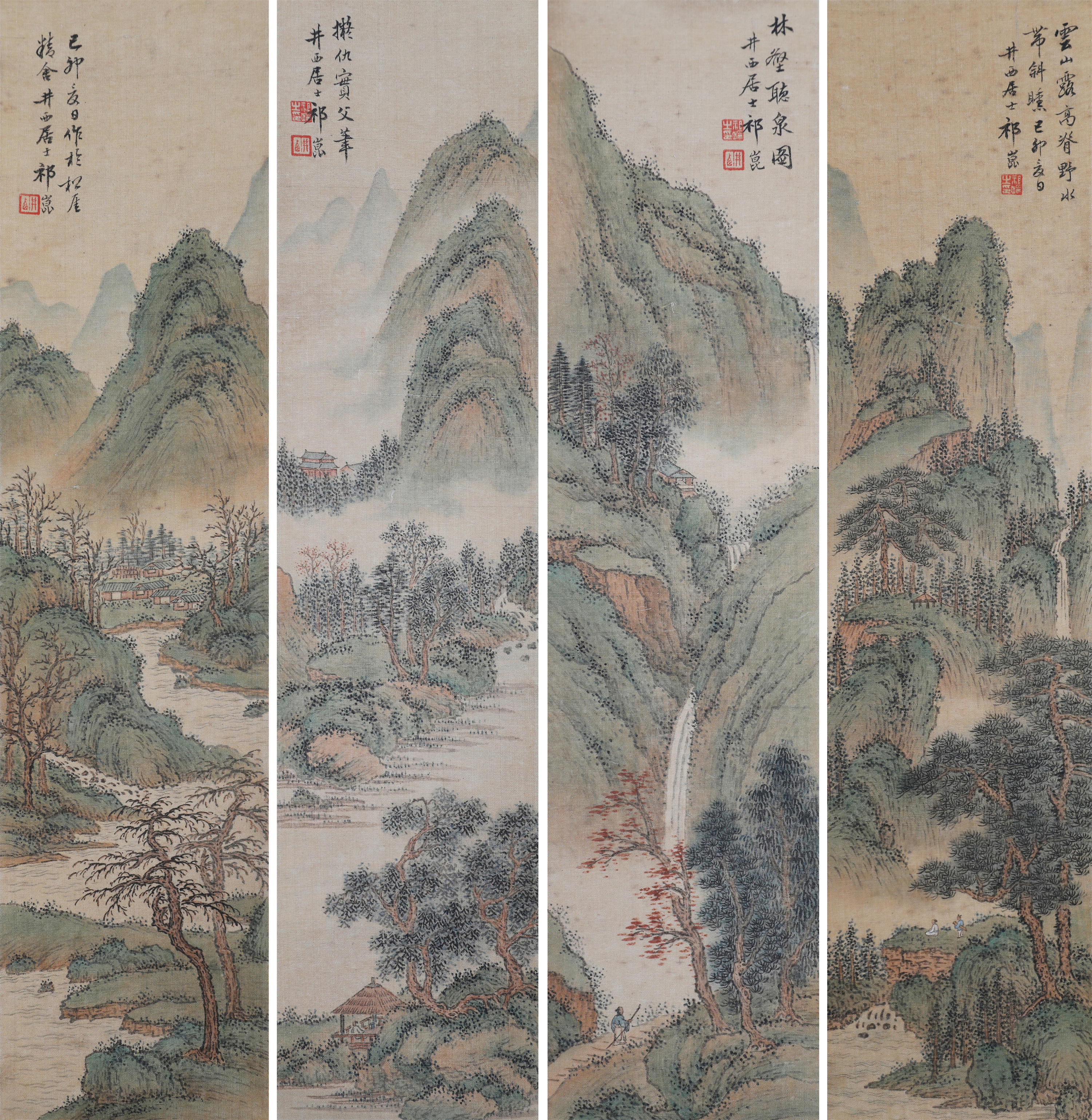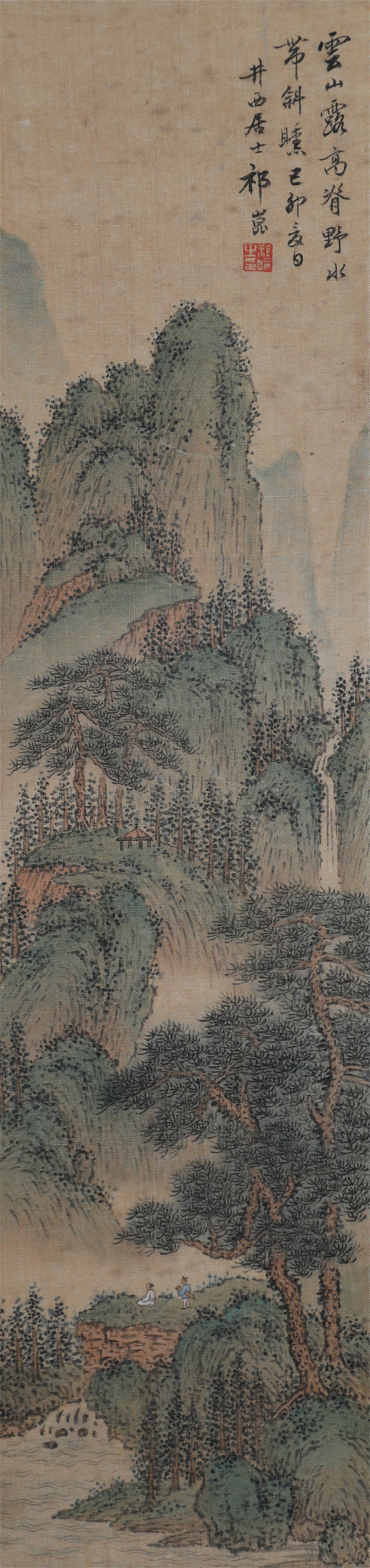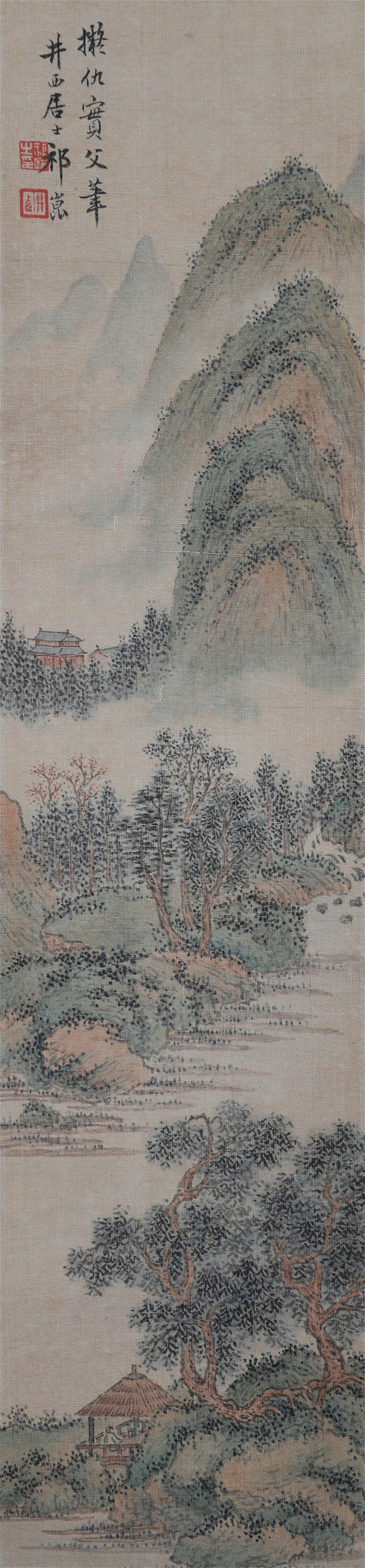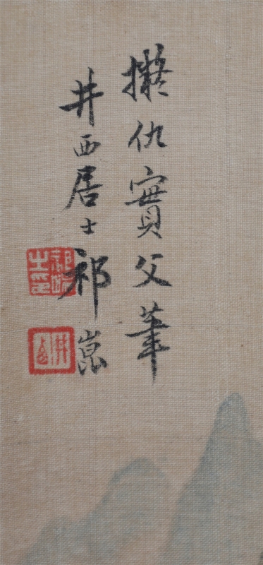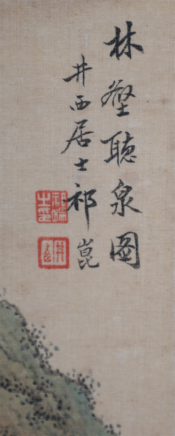祁井西(又名祁昆1901—1944)字景西,号井西居士,斋号曰松崖精舍。北京人。初以籹卖颜色得识京城名家,刻励自学。因受民初追踪宋元之风的影响,专意摹古临古,尚北宗山水,所画理法精严,笔墨精致,枯润合度。在20-40年代的北京有一定影响。工细山水得明人遗意,又精篆刻。性喜犬,室内床上下所蓄犬无思十余头,可谓奇癖,所作山水,规模明人,而近于王翚。作风精细清润,构图全出之正统派民国初年北京画坛以王翚为“神圣不可侵犯”,祁氏亦受影响,在学王诸诸家中堪称翘楚。但用笔略嫌拘谨板实,工稳有余,创意不足。弟子有郭传璋、徐鼎正、梁树年等。