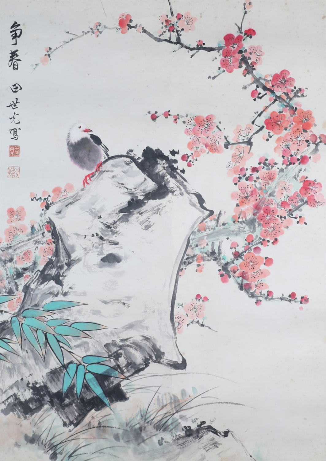 田世光(1916年10月—1999年7月)号公炜,祖籍山东乐陵,世居北京西海淀六郎庄。师承张大千、赵梦朱、吴镜汀、于非闇、齐白石诸先生。早年拜张大千门下,为大风堂弟子之一 。早年求学于京华美术学院,专攻国画花鸟,解放前在北平国立艺专任教,曾任中央美院教授。他长期从事花鸟、山水画创作,继承了宋元派双勾重彩工笔花鸟画的优良传统技法,并赋之予新的时代精神,为我国现代工笔花鸟画名家。田世光先生是中国美术家协会会员,北京工笔重彩画副会长,中国画研究院第一届院务委员。