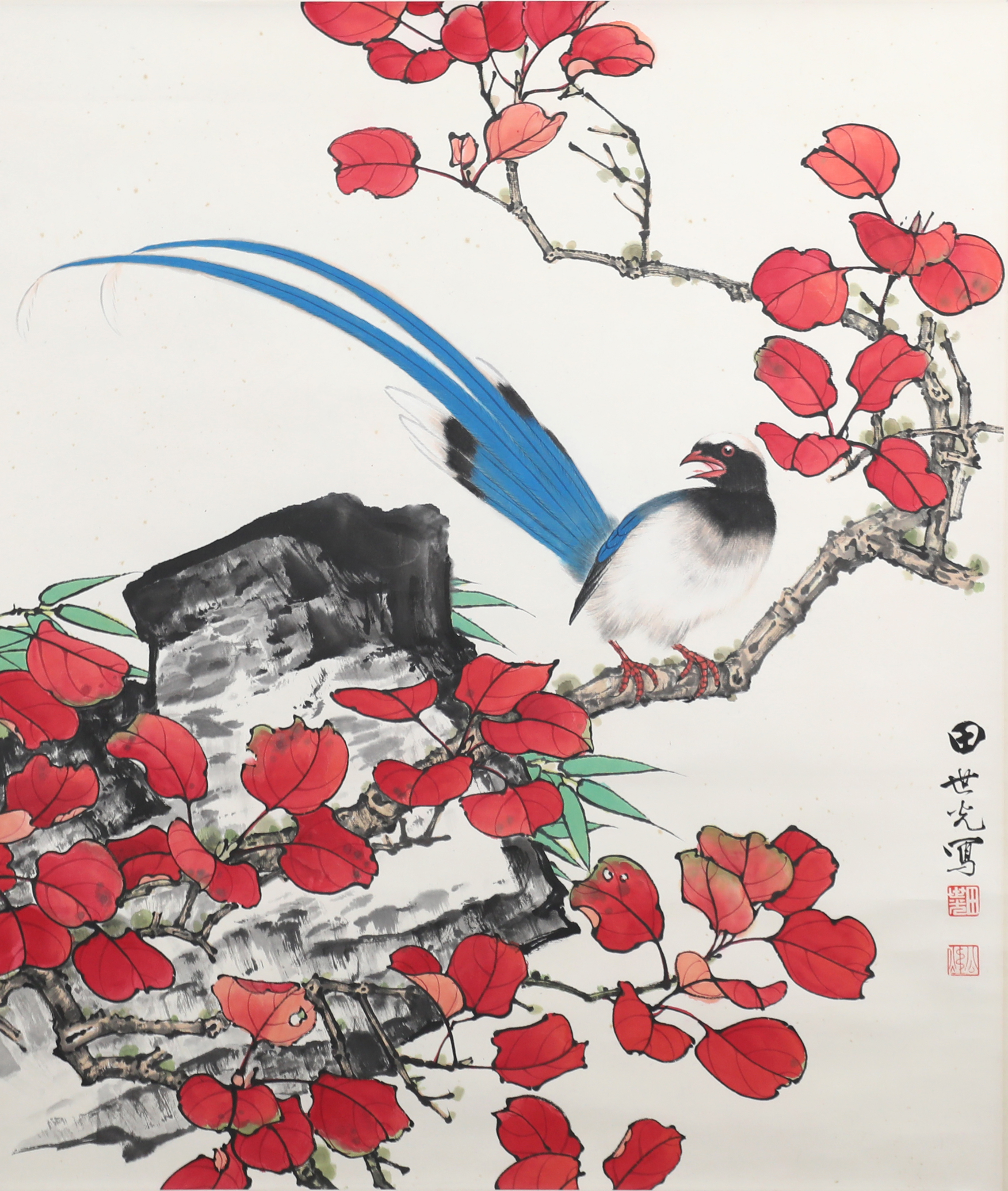 田世光(1916年10月—1999年7月)号公炜,祖籍山东乐陵,世居北京西海淀六郎庄。师承张大千、赵梦朱、吴镜汀、于非闇、齐白石诸先生。早年拜张大千门下,为大风堂弟子之一 。早年求学于京华美术学院,专攻国画花鸟,解放前在北平国立艺专任教,曾任中央美院教授。他长期从事花鸟、山水画创作,继承了宋元派双勾重彩工笔花鸟画的优良传统技法,并赋之予新的时代精神,为我国现代工笔花鸟画名家。田世光先生是中国美术家协会会员,北京工笔重彩画副会长,中国画研究院第一届院务委员。