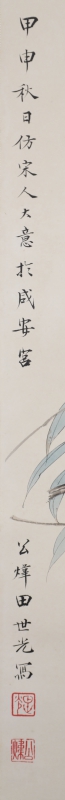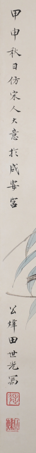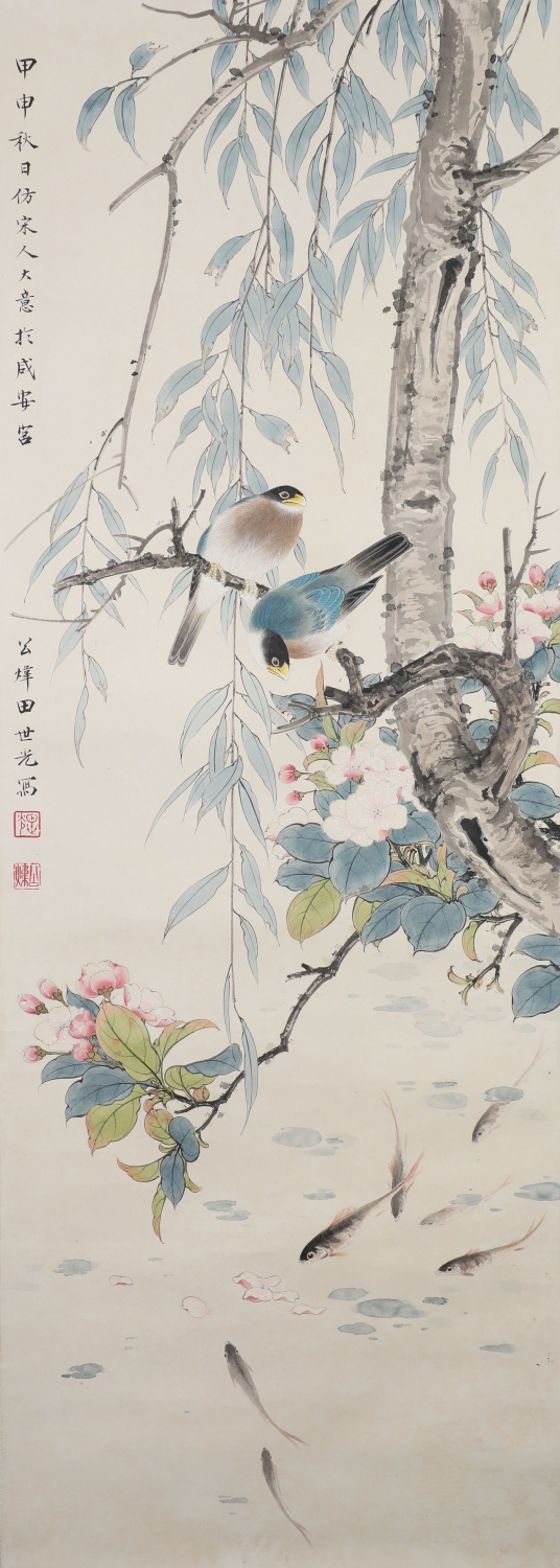 田世光(1916年10月—1999年7月)号公炜,祖籍山东乐陵,世居北京西海淀六郎庄。师承张大千、赵梦朱、吴镜汀、于非闇、齐白石诸先生。早年拜张大千门下,为大风堂弟子之一 。早年求学于京华美术学院,专攻国画花鸟,解放前在北平国立艺专任教,曾任中央美院教授。他长期从事花鸟、山水画创作,继承了宋元派双勾重彩工笔花鸟画的优良传统技法,并赋之予新的时代精神,为我国现代工笔花鸟画名家。田世光先生是中国美术家协会会员,北京工笔重彩画副会长,中国画研究院第一届院务委员。