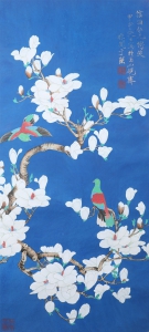 编号:8471 作者:于非厂 名称:玉兰双鸽 规格:34*75cm 形式:纸本立轴 备注:
