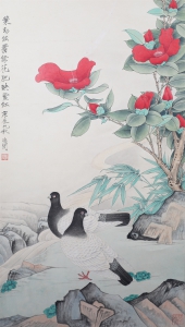编号:10056 作者:于非厂 名称:牡丹双鸽 规格:35*91cm 形式:纸本立轴 备注: