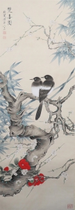 编号:9080 作者:于非厂 名称:喜鹊 规格:27*68cm 形式:绢本立轴 备注: