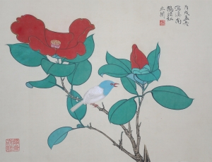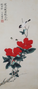 编号:9305 作者:于非厂 名称:茶花山雀 规格:26*62cm 形式:纸本立轴 备注: