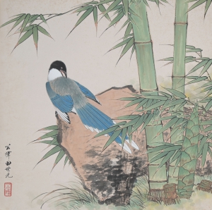 编号:7854 作者:田世光 名称:竹荫双雀 规格:32*33cm 形式:纸本镜心 备注: