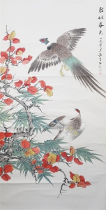 编号:9717 作者:田世光 名称:红叶双雀图 规格:66*136cm 形式:纸本立轴 备注: